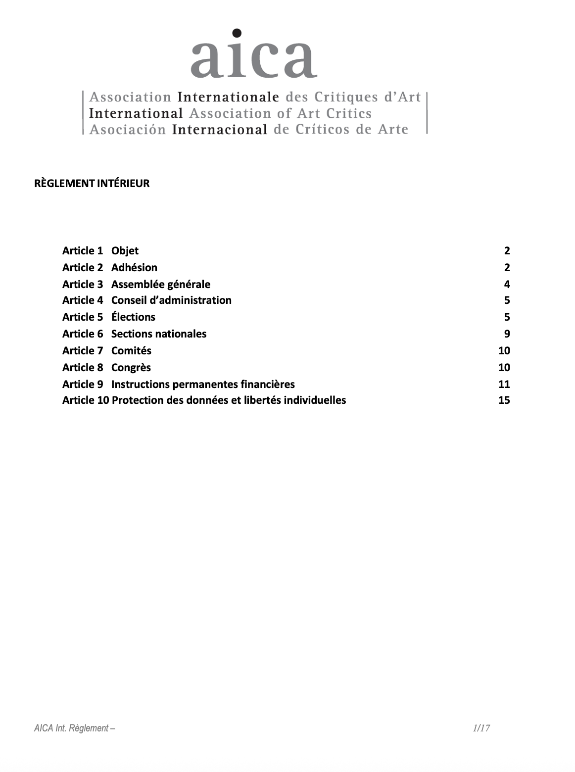 Le présent Règlement intérieur a pour objet de fixer les règles de fonctionnement de l'AICA et de compléter les statuts de l'AICA.