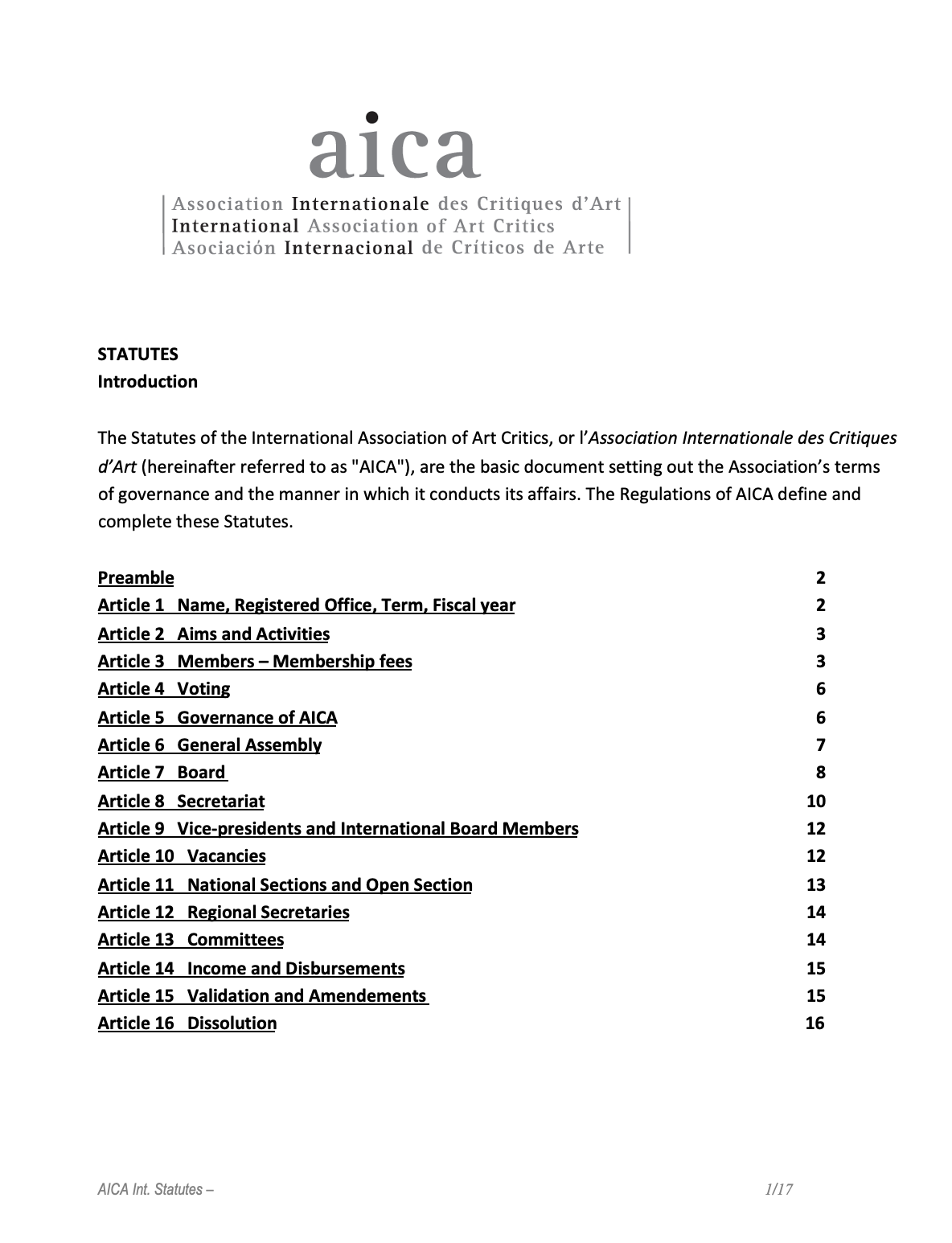 The Statutes of the International Association of Art Critics is the core document of the organisation. The Regulations are the Internal document of AICA International and complete the Statutes.